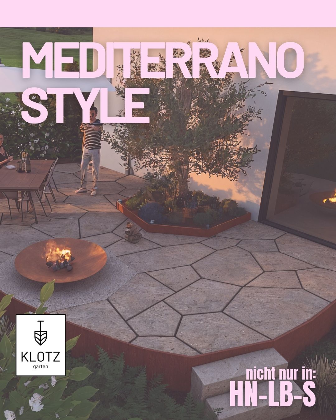 Inspirationen für die kommende Saison. Hochwertige Natursteinküche aus kroatischem Kalkstein, kombiniert mit einer Cortenstahl-Sichtschutzwand und südländischen Pflanzen.