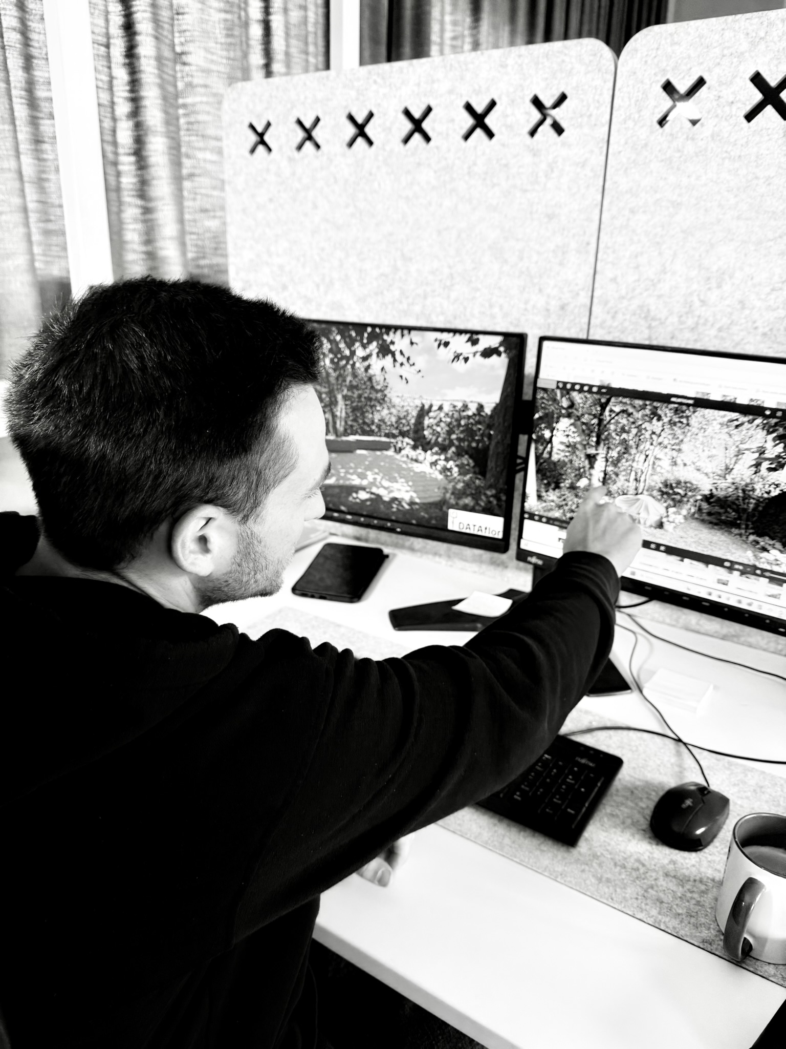Marcel Zürn, Techniker im Garten- und Landschaftsbau hat sich dieser Aufgabe verschrieben. Mit größter Leidenschaft und entsprechender Expertise gelingt es ihm-, mit dem anspruchsvollen Vermessungsgeräten, und der Software, perfekte virtuelle Ergebnisse zu präsentieren.